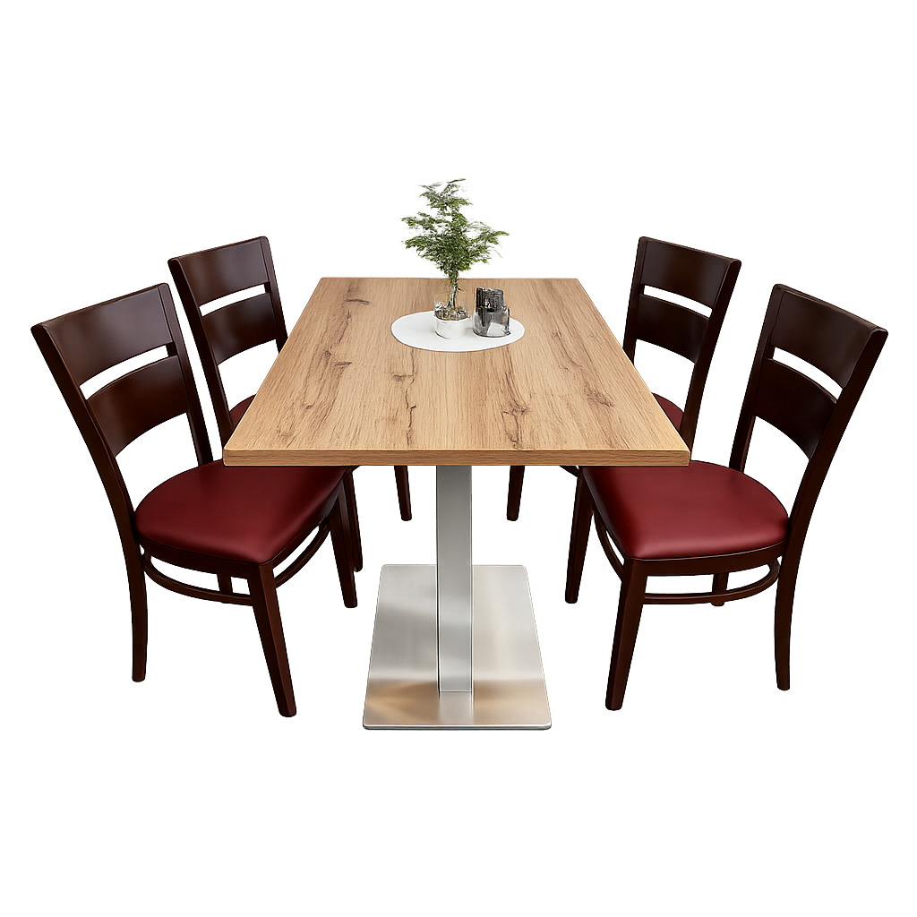 Diese professionelle Restaurant-Sitzgruppe (auch Restaurantgarnitur oder Sitzgruppe genannt) ist die perfekte Lösung für Gastronomie, Restaurant, Bistro, Café, Bar oder Hotel. Die Kombination aus stabilem Tisch mit Gußeisentischbein und vier komfortablen Massivholzstühlen vereint Langlebigkeit, Funktionalität und ein zeitloses Design – ideal für den täglichen, intensiven Einsatz im gewerblichen Bereich.