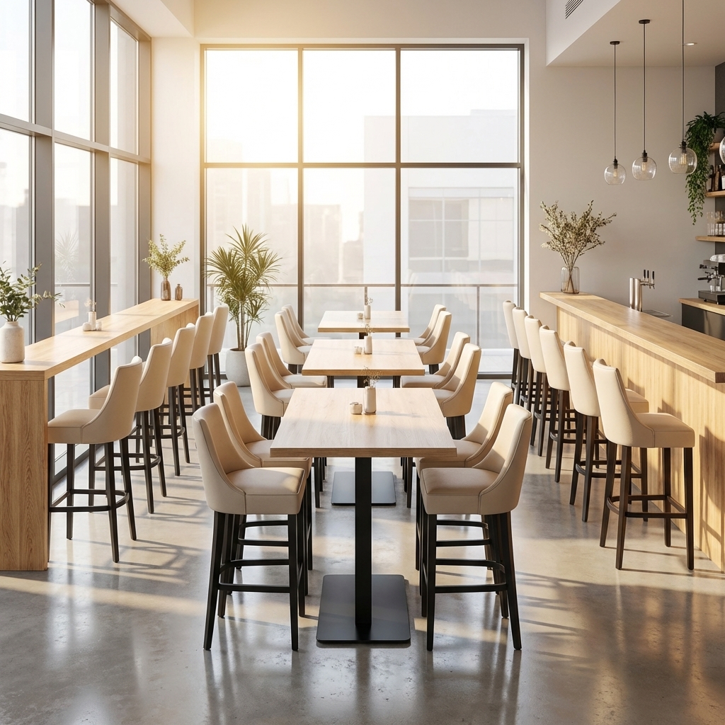 Das Gestell aus massivem Buchenholz sorgt für hohe Stabilität und Standfestigkeit. Gleichzeitig verleiht das Naturmaterial dem Barhocker für Gastronomie eine hochwertige und professionelle Optik, die perfekt zu modernen Bar Möbeln und Gastronomie Einrichtungen passt.