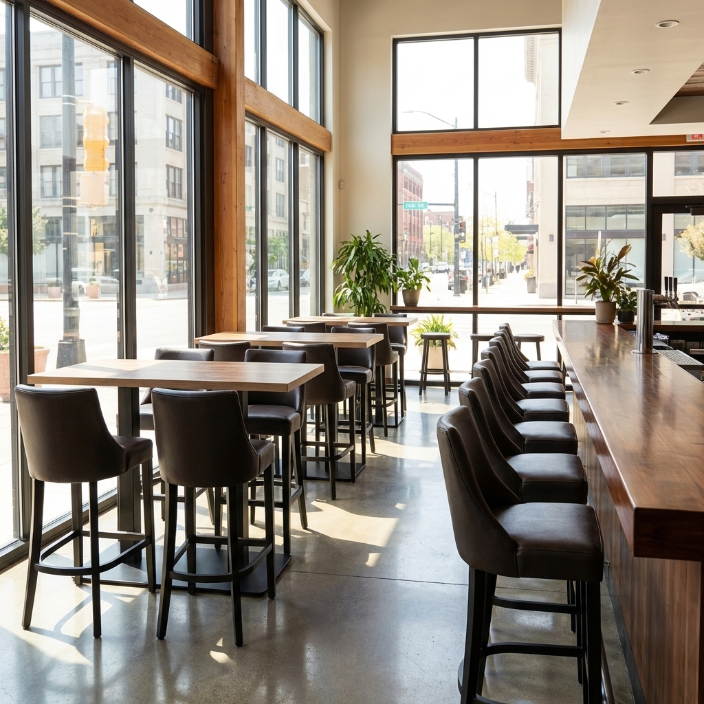 Mit seinem eleganten Kunstlederbezug in Dunkelbraun und dem stabilen Massivholzgestell aus Buche verbindet der Tresenhocker Finja zeitloses Design mit hoher Belastbarkeit und langlebiger Qualität für Gastronomiebetriebe.
