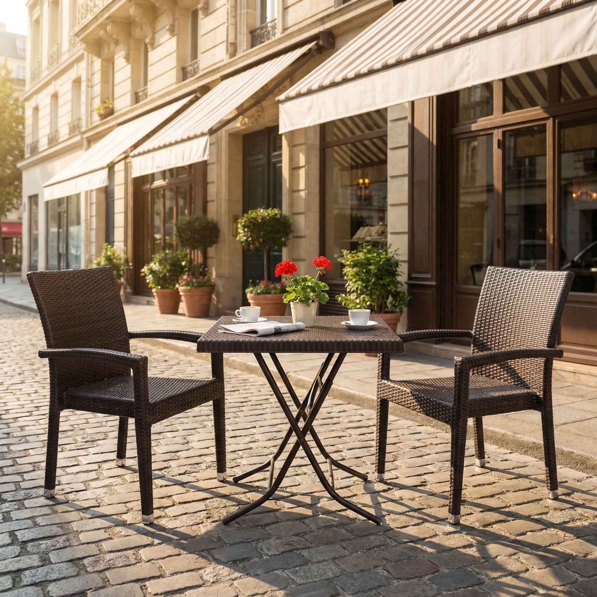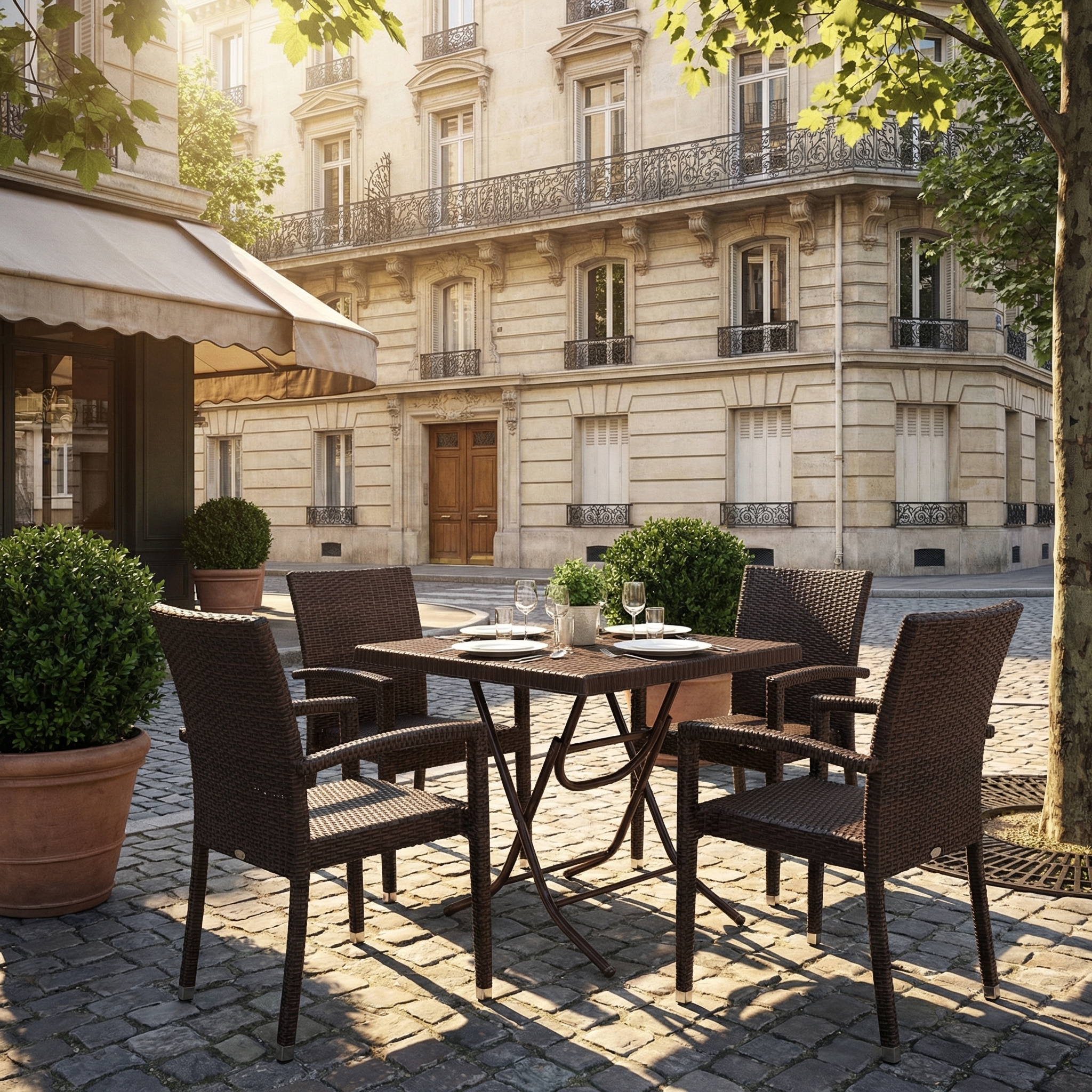 Die Oberfläche ist wasserfest und leicht zu reinigen, wodurch der Tisch optimal für stark frequentierte Außenbereiche eingesetzt werden kann. Sein modernes, zeitloses Design in Braun fügt sich harmonisch in verschiedenste Gastronomiekonzepte ein – von klassischem Café bis zur modernen Restaurantterrasse.