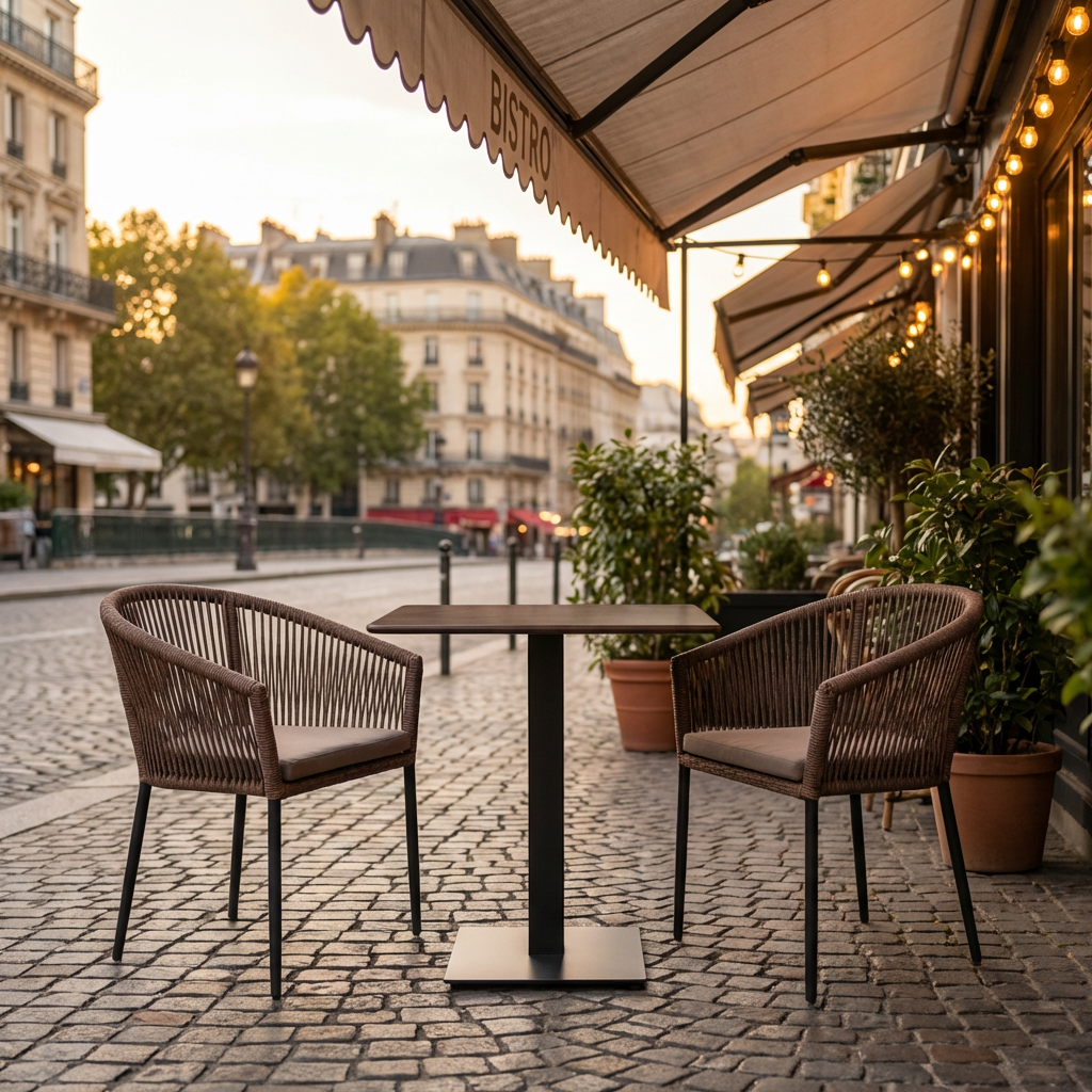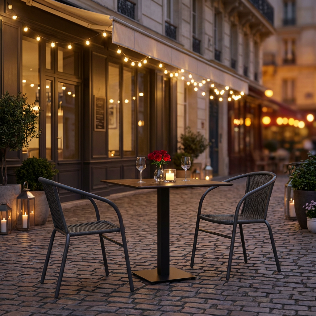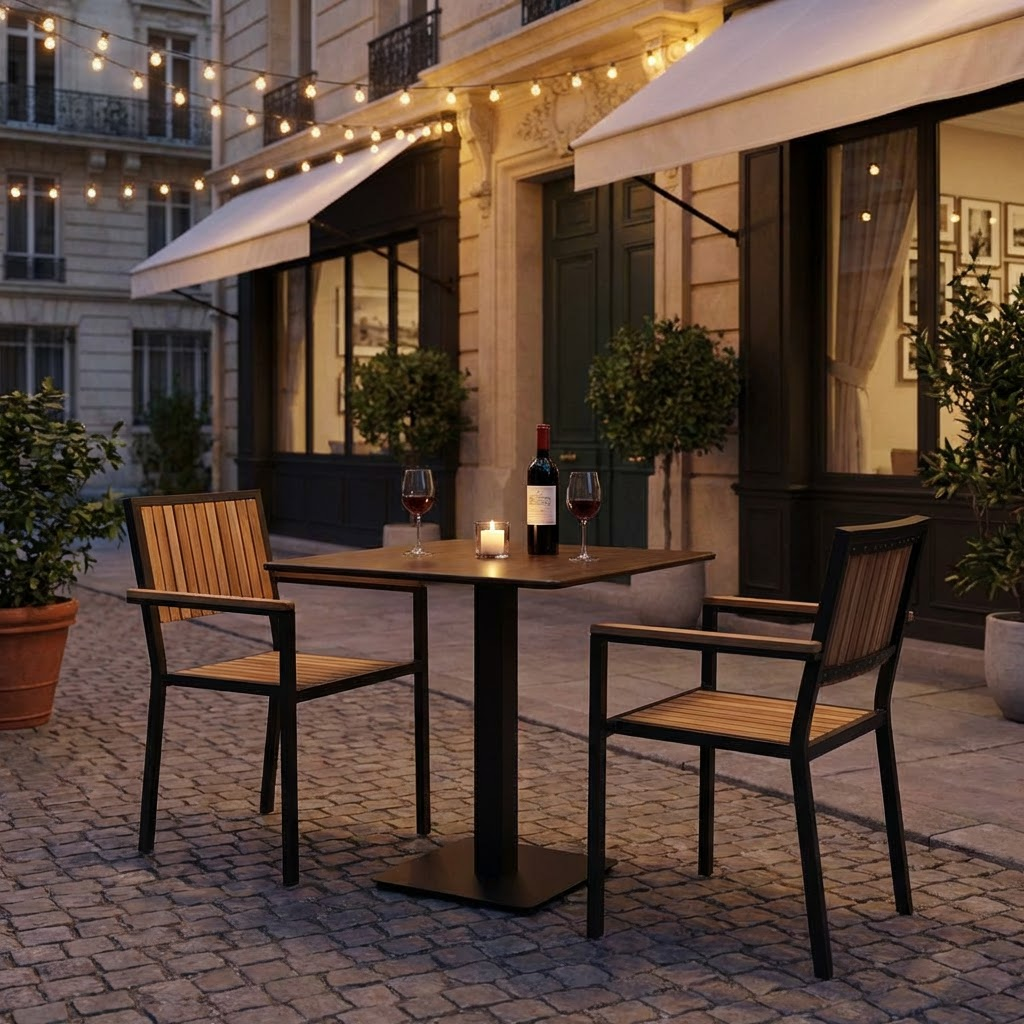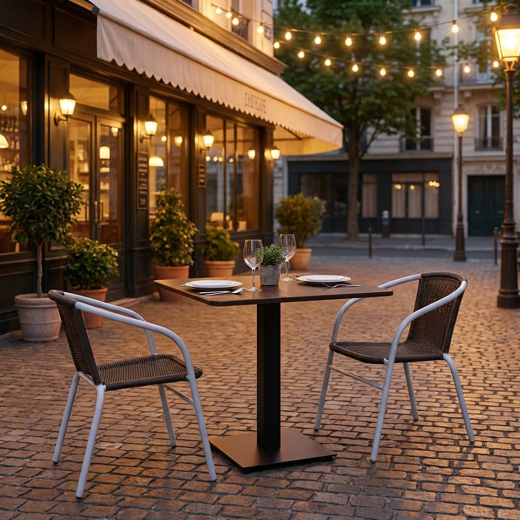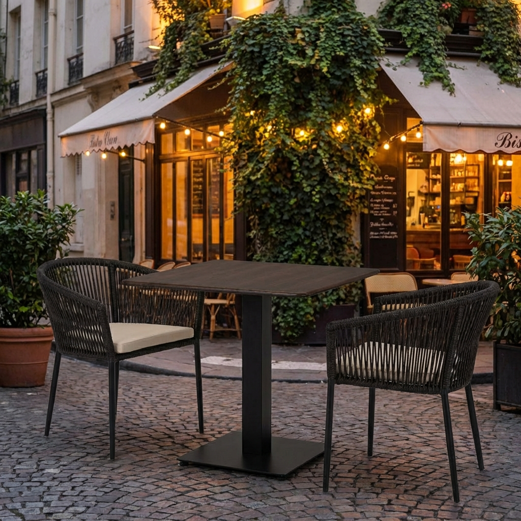 Mit seiner kompakten Größe ist dieser Bistro-Tisch für die Außengastronomie besonders flexibel einsetzbar. Er ermöglicht eine effiziente Nutzung Ihrer Terrassenfläche und bietet dennoch ausreichend Platz für zwei bis vier Personen.