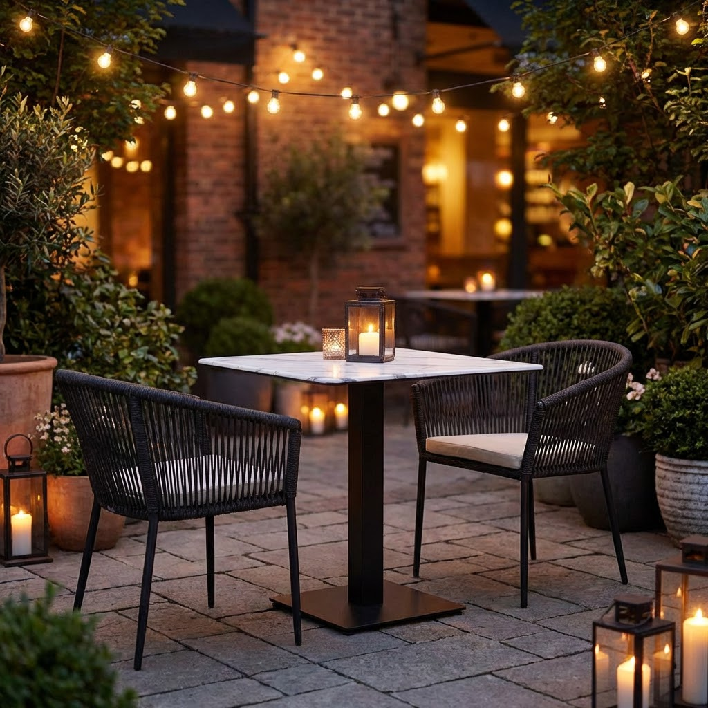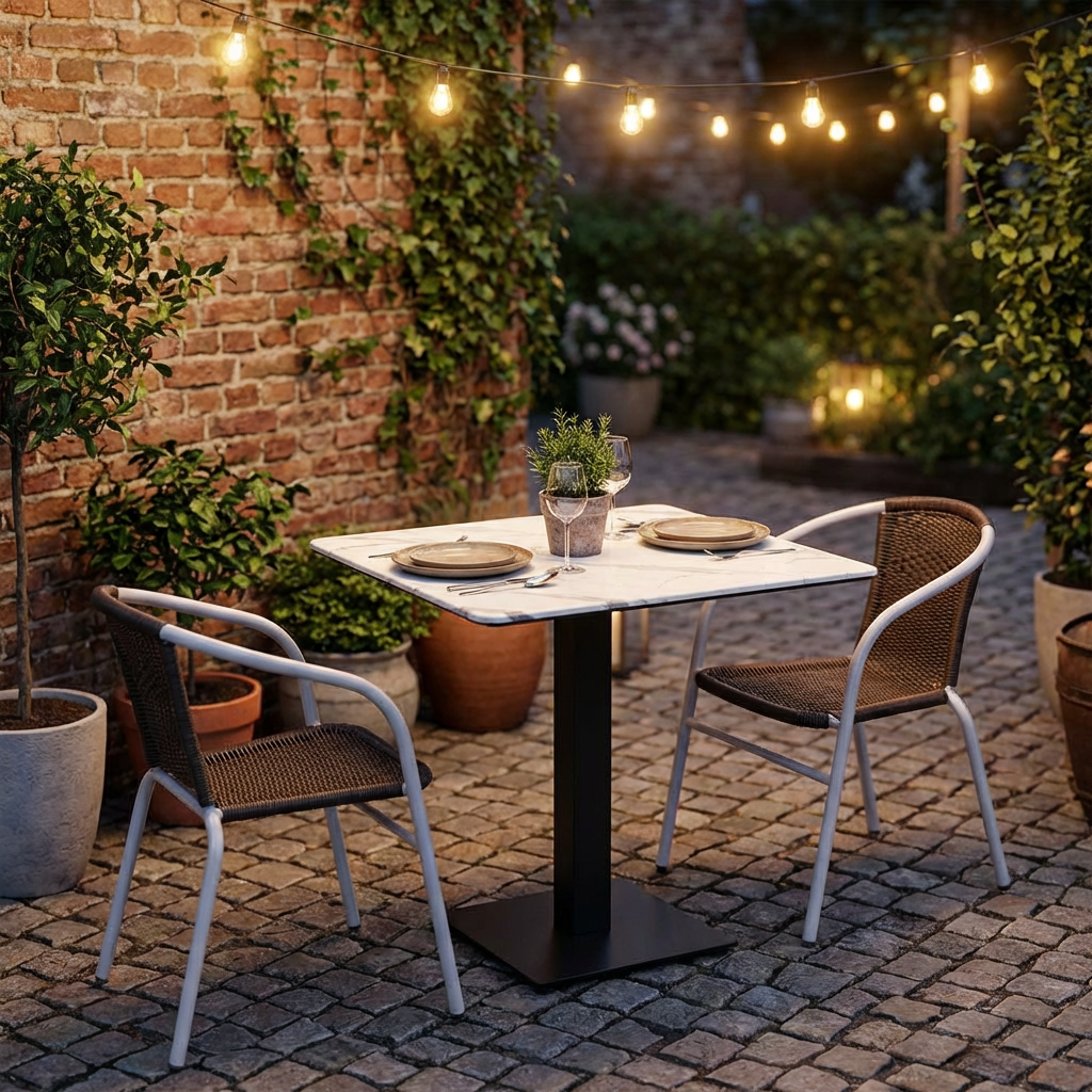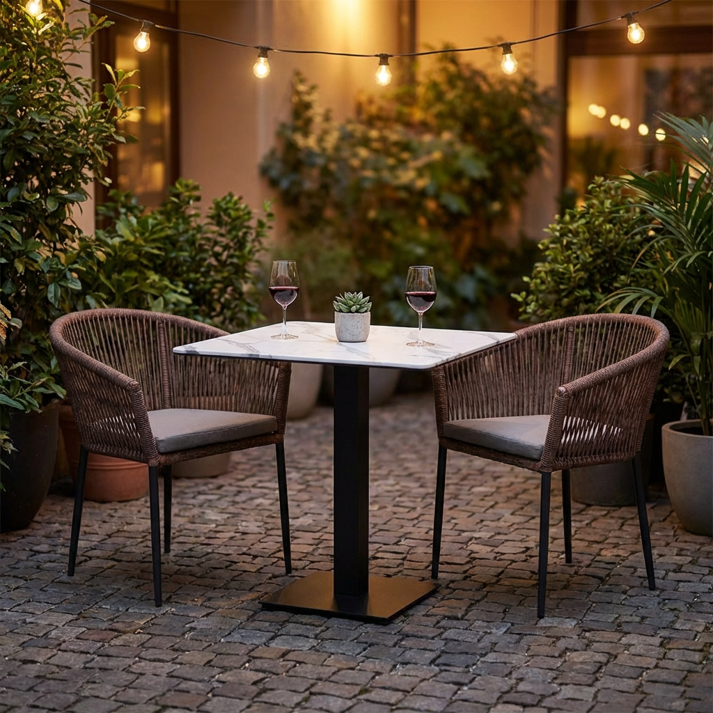Mit seiner kompakten Größe ist dieser Bistro-Tisch für die Außengastronomie besonders flexibel einsetzbar. Er ermöglicht eine effiziente Nutzung Ihrer Terrassenfläche und bietet dennoch ausreichend Platz für zwei bis vier Personen.