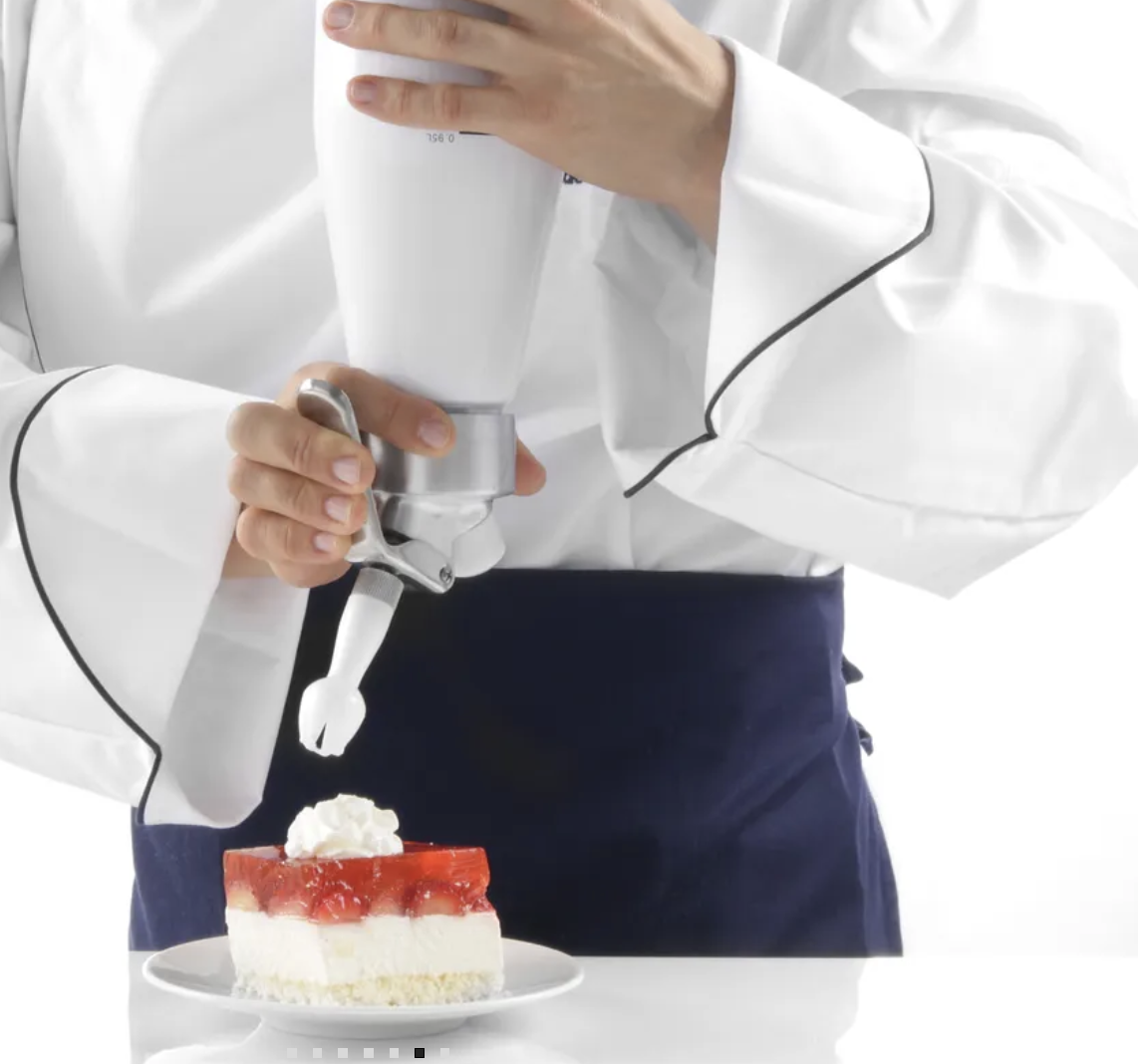Dank des mitgelieferten Sets aus drei Polypropylen-Spritztüllen lassen sich unterschiedliche Garnier- und Dekorationsformen für Desserts, Kaffee-Spezialitäten oder Buffetplatten einfach umsetzen. Eine Reinigungsbürste ist ebenfalls enthalten, damit der Sahnespender schnell und hygienisch gereinigt werden kann.